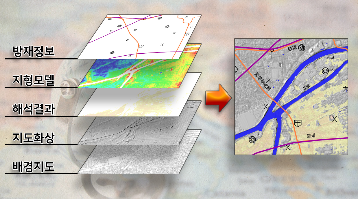 지리정보시스템(GIS)을 이용하여 국가기본 지리정보나 항공사진, DM데이터를 기초로 계산모델의 작성이나 해석결과의 가시화, 해저드맵을 작성합니다. GIS데이터는 형상뿐만이 아니라 종별, 작성년도, 구조 등의 속성데이터가 포함되어 있으므로 데이터의 공간해석이나 통계처리가 가능합니다. 특히 하천 범람이나 지진해일범람의 업무에 관해서는 데이터작성부터 범람 시뮬레이션, 해저드맵 작성의 많은 실적이 있습니다. 또한, 방재에 관련된 주민설명용 자료나 Web에 공개하는 방재정보의 콘텐츠도