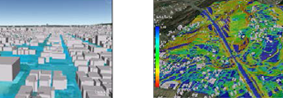3차원 리모델링소프트웨어를 이용하여, 지형·건설데이터, 위성·항공사진 등을 활용하면서 버추얼리얼리티(VR)의 시스템을 구축합니다. 그리고 수치시뮬레이션 결과를 이용하여 이해하기 쉽게 재해 CG· 영상을 제공합니다. 피난시뮬레이션 결과를 이용하여, 게임엔진으로 가상현실을 구축하여 피난체험형 VR제공이 가능합니다.