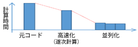 현대의 컴퓨터는 상호결합망에 의해 접속된 복수의 계산 노드나 CPU, CPU코어 등 계층적인 병렬화 구성을 가지고 있습니다. 또한 GPU 등의 액셀러레이터도 많이 사용됩니다. 이러한 다양한 하드웨어구성에 대해서 대상이 되는 프로그램 특성, 입력데이터에 맞는 프로그램의 고속화를 실시합니다. 또한 필요에 따라 수식화 방법의 검증과 알고리즘의 변경을 포함하는 프로그램의 최적화를 실시합니다.