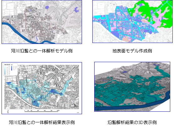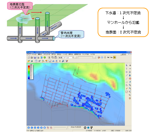 ・유출해석소프트상의 하수도 1차원모델과 지표면 2차원모델의 통합해석을 실시하는 것에 의해 지표면 범람계산을 실시