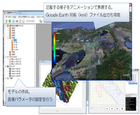 입력된 강우량(아메다스, 레이더강우량등)에서 범람 해석엔진을 이용하여 자동계산하여 결과를 표시