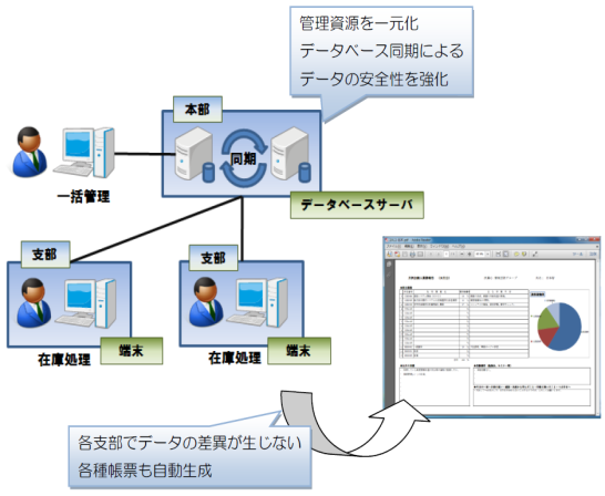 각 지부 등은 네트워크에 의해 항상 최신데이터를 열람하여 본부·지부와의 정보차이가 없이 관리공정을 줄이고 재고의 일괄발주에 의해 비용 절감의 기대가능
